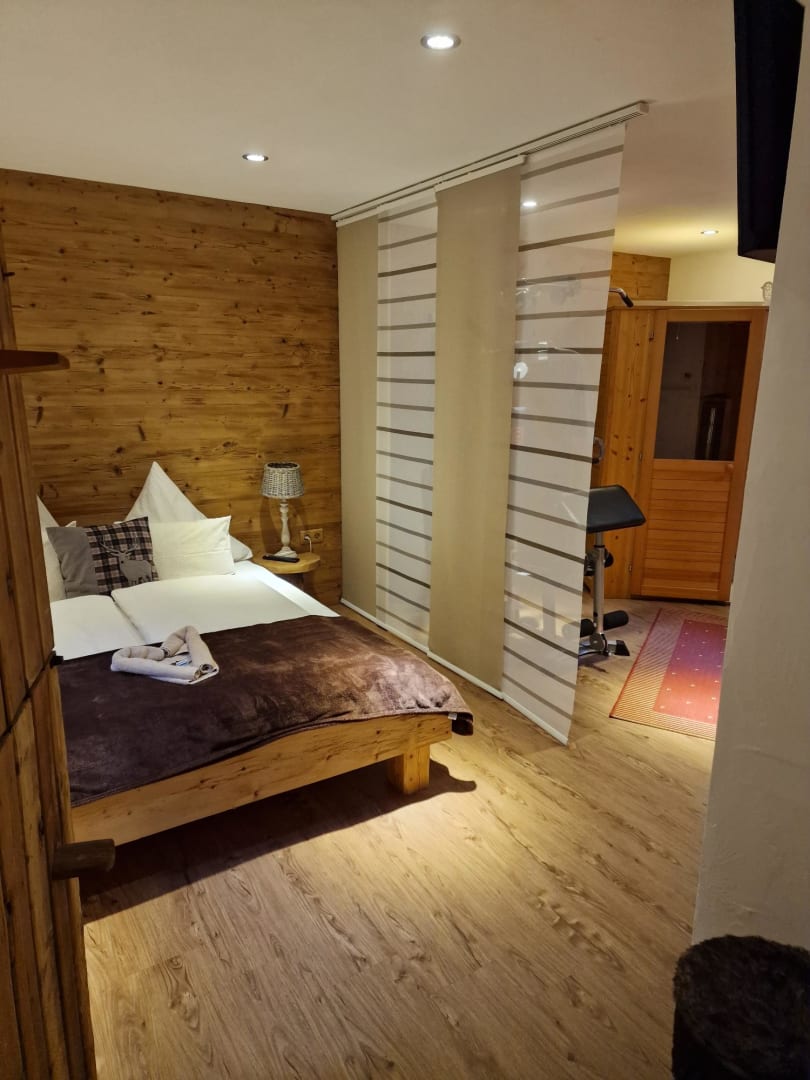 Schlafzimmer im UG mit TV, optisch abgetrennt vom Wellnessbereich