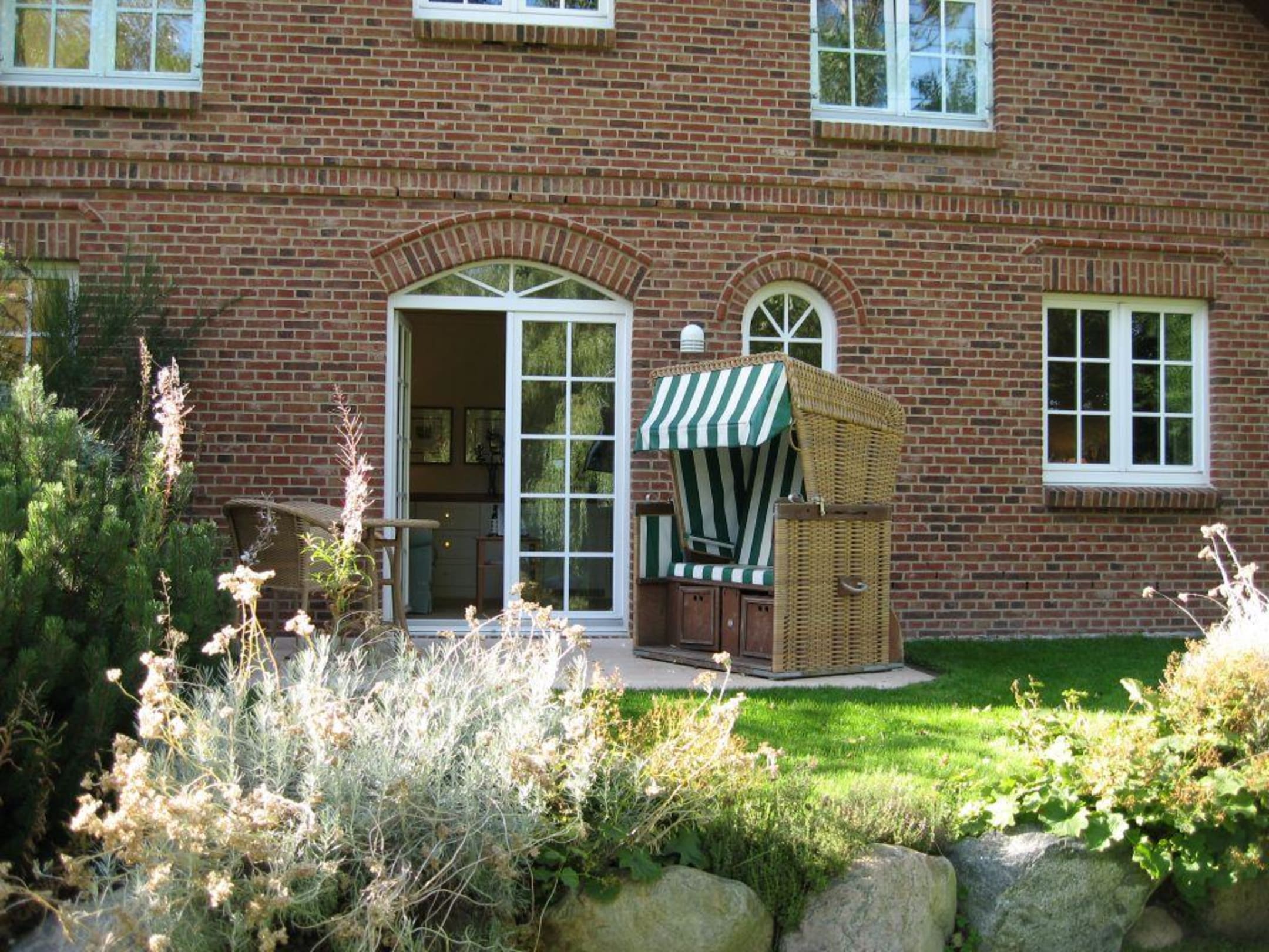 Die Junior Suite von außenJedes Zimmer verfügt über eine Terrasse mit Strandkorb oder einen Balkon mit Cafetisch.