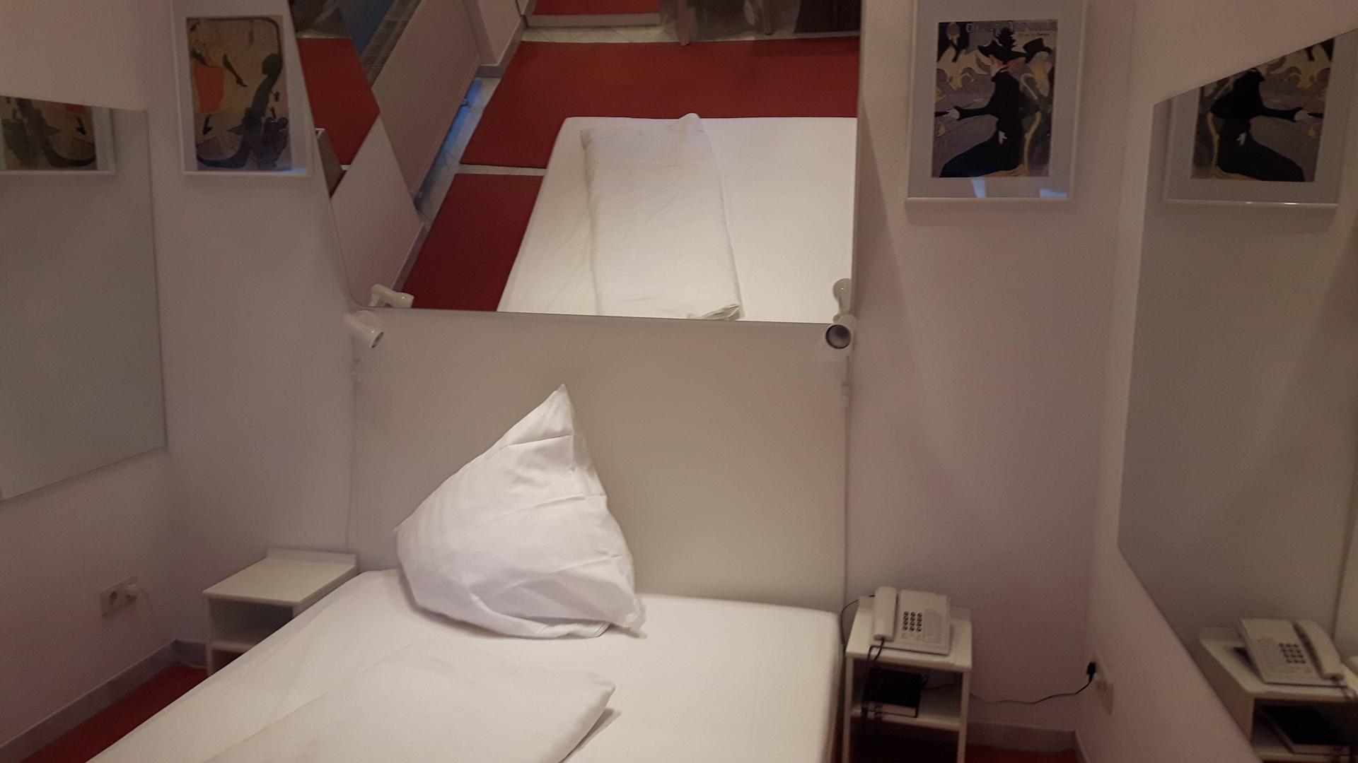 Bett mit Spiegeln umzingelt