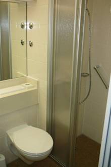 Badezimmer Hier wurde bewust auf die Duschwanne verzichtet. Für Menschen mit Gehbehinderungen ist die Dusche daher gut geeignet.