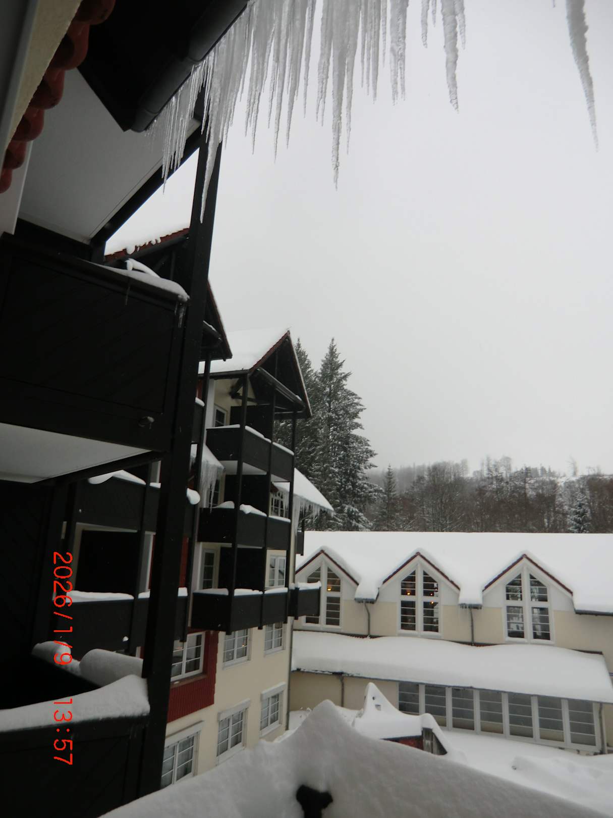 Eiszapfentropfen über offenem Außenbalkon