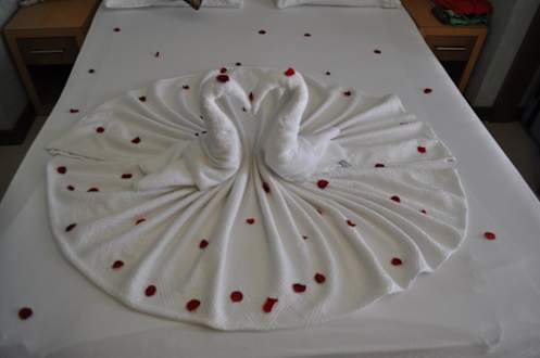 The rooms are cleaned every day. This folding of towels doesn't happen every day, but once in a while. Leaves you with a smile when it happens.