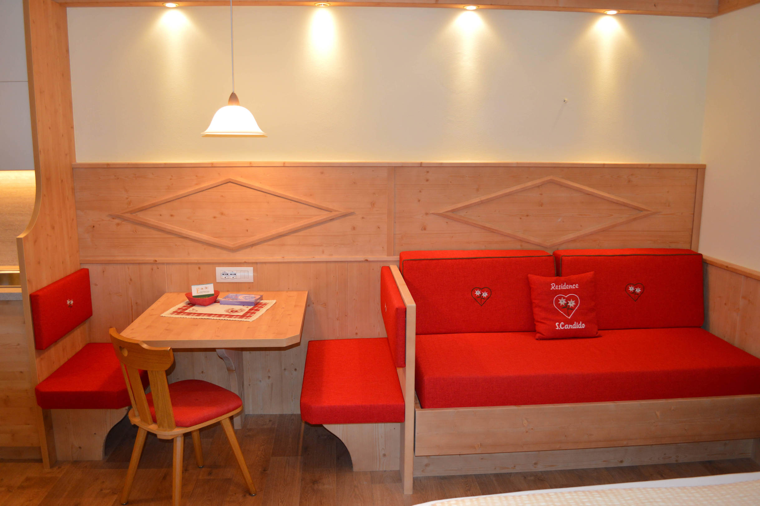 angolo soggiorno con divano letto in stile tirolese, tutto in legno / Wohnecke mit Schlafcouch im Tiroler Stil, alles aus Holz