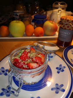 Frühstück hier ein leckerer Erdbeerjoghurt mit Crunch