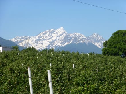 Blick vom Garten auf die Apfelbäumen und Bergen