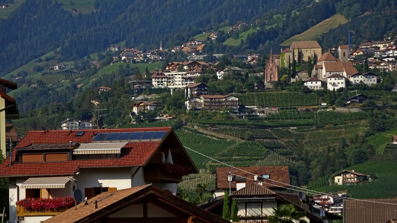 vom Pulverturm die Residenz mit Solarzellen Richtung Schenna im Hintergrund