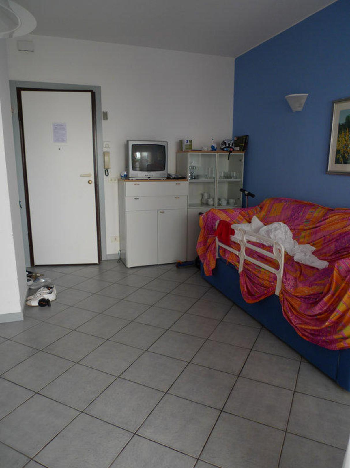 Fotografiert im Wohnzimmer Richtung Eingangstüre. Rechts das (Bett-) Sofa, welches wir "umfunktioniert" hatten als Bett für unseren Sohn, mit Rausfallschutz.