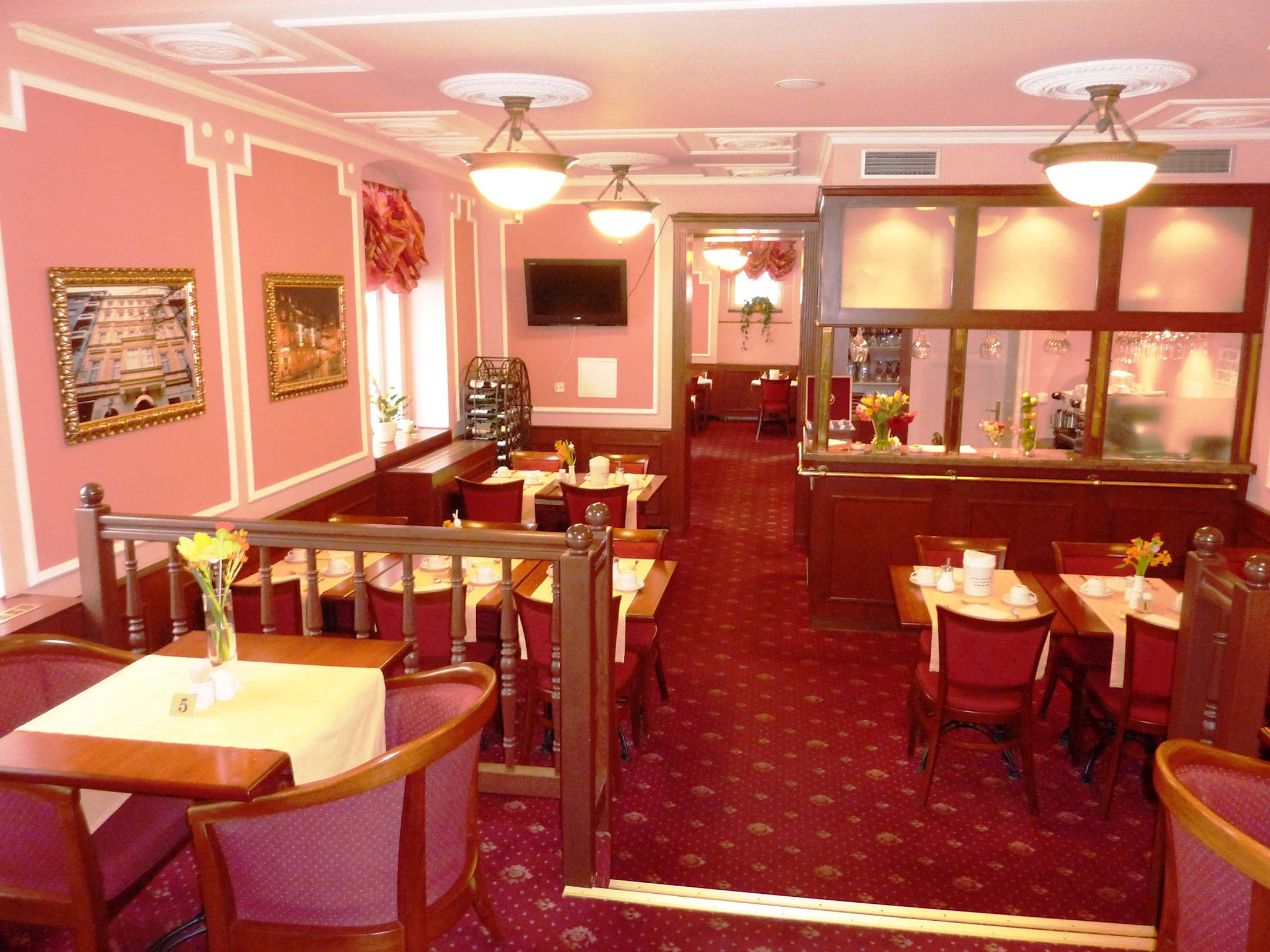 Das hoteleigene Restaurant Romeo und Julia befindet sich links vom Haupteingang des Hotels, also Parterre im Haus Julia. Hier gibt es sowohl das Frühstücksbuffet als auch Kaffe+Kuchen oder a la Cart Abendessen.