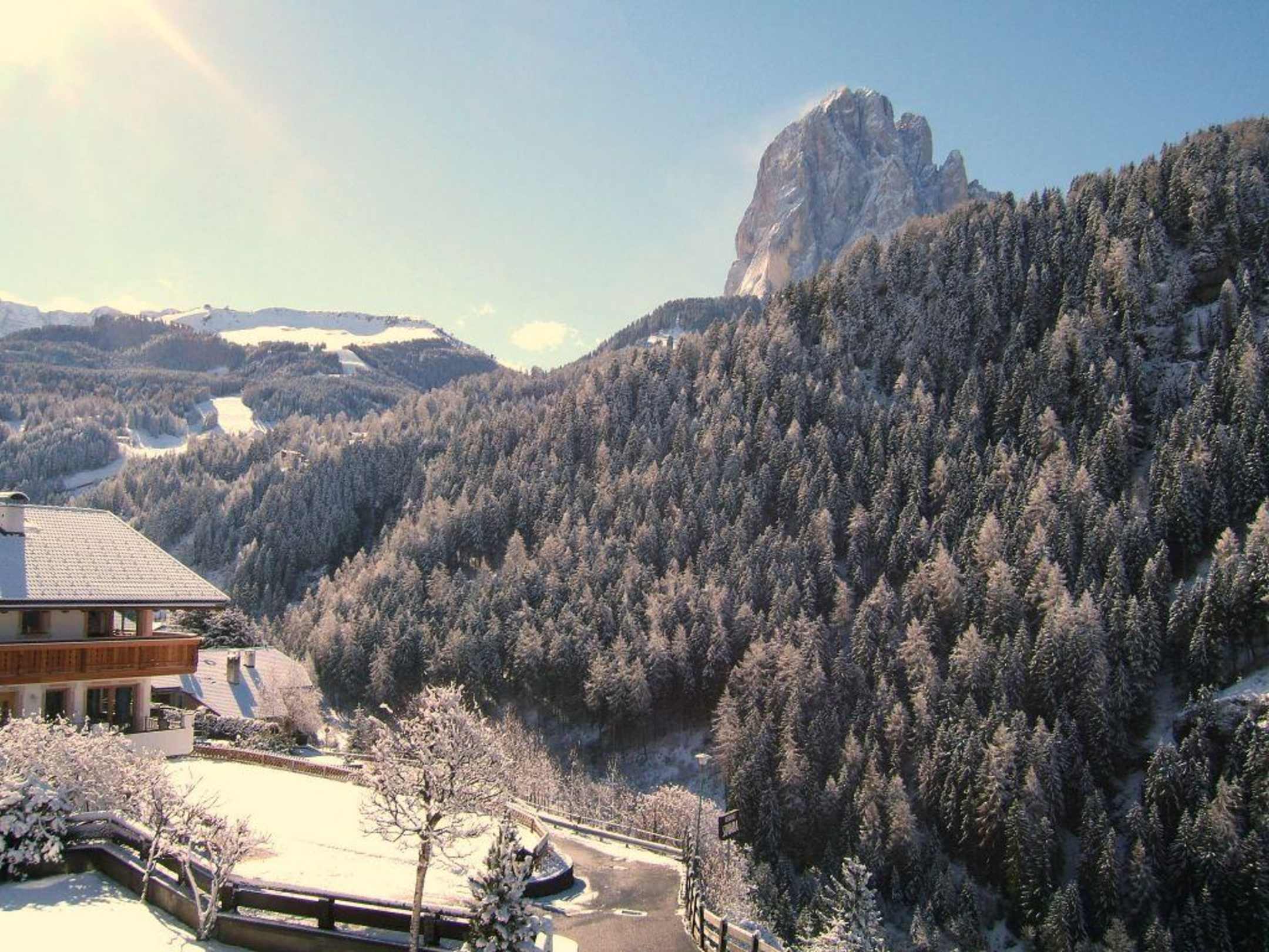 Blick auf Langkofel vom Balkon unserer Ferienwohnung in der Residenz SOVARA .