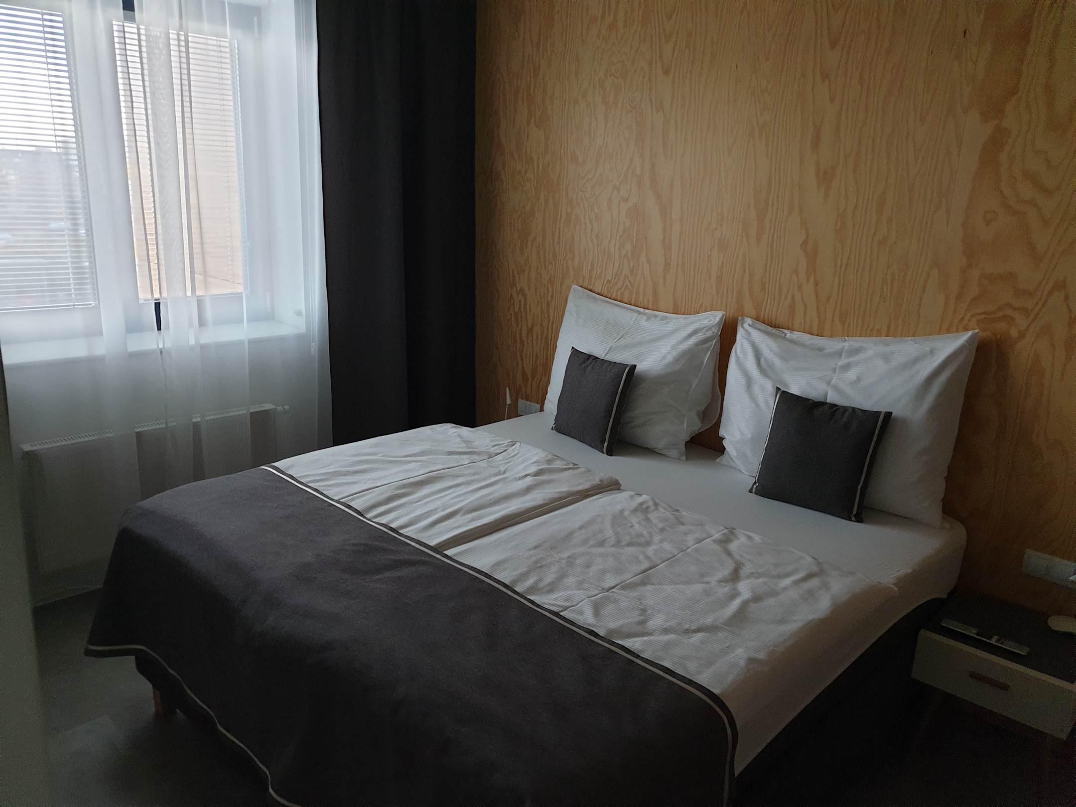ZimmerGutes Bett mit einer durchgängigen Matratze auf einem Doppelbett, aber eine recht doch spartanische Wand.