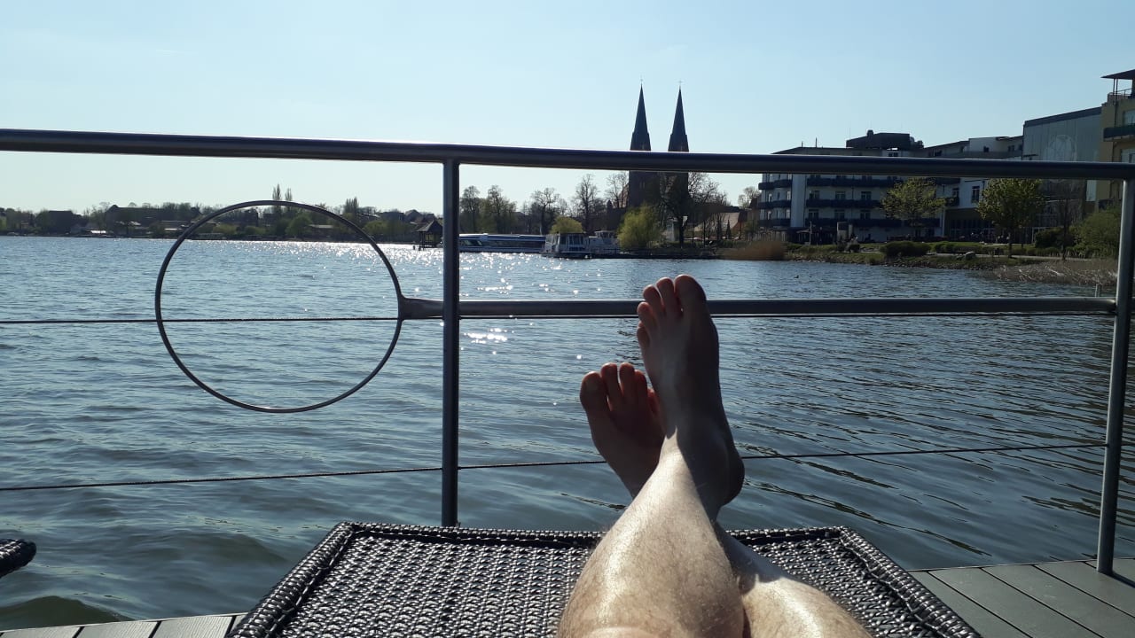 Blick von der schwimmenden Seesauna aufs Hotel.