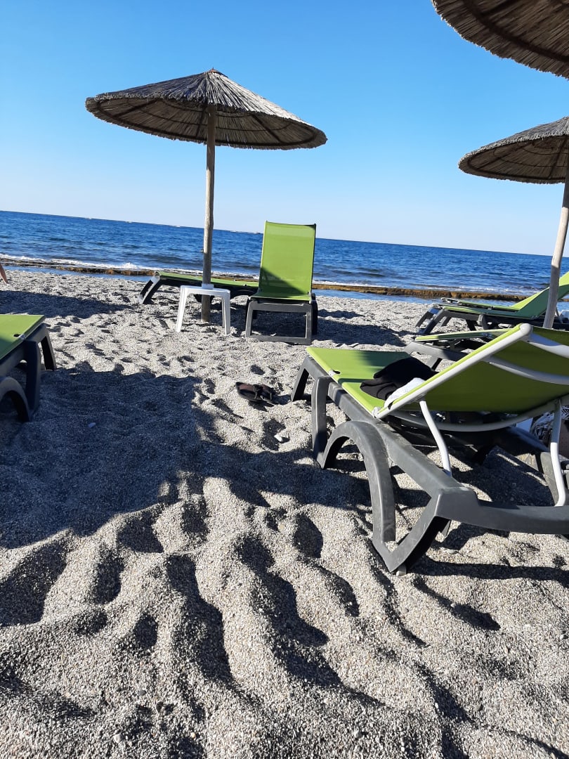 Am Strand gibt es Schirme mit je 2 Liegen und einem Tischlein