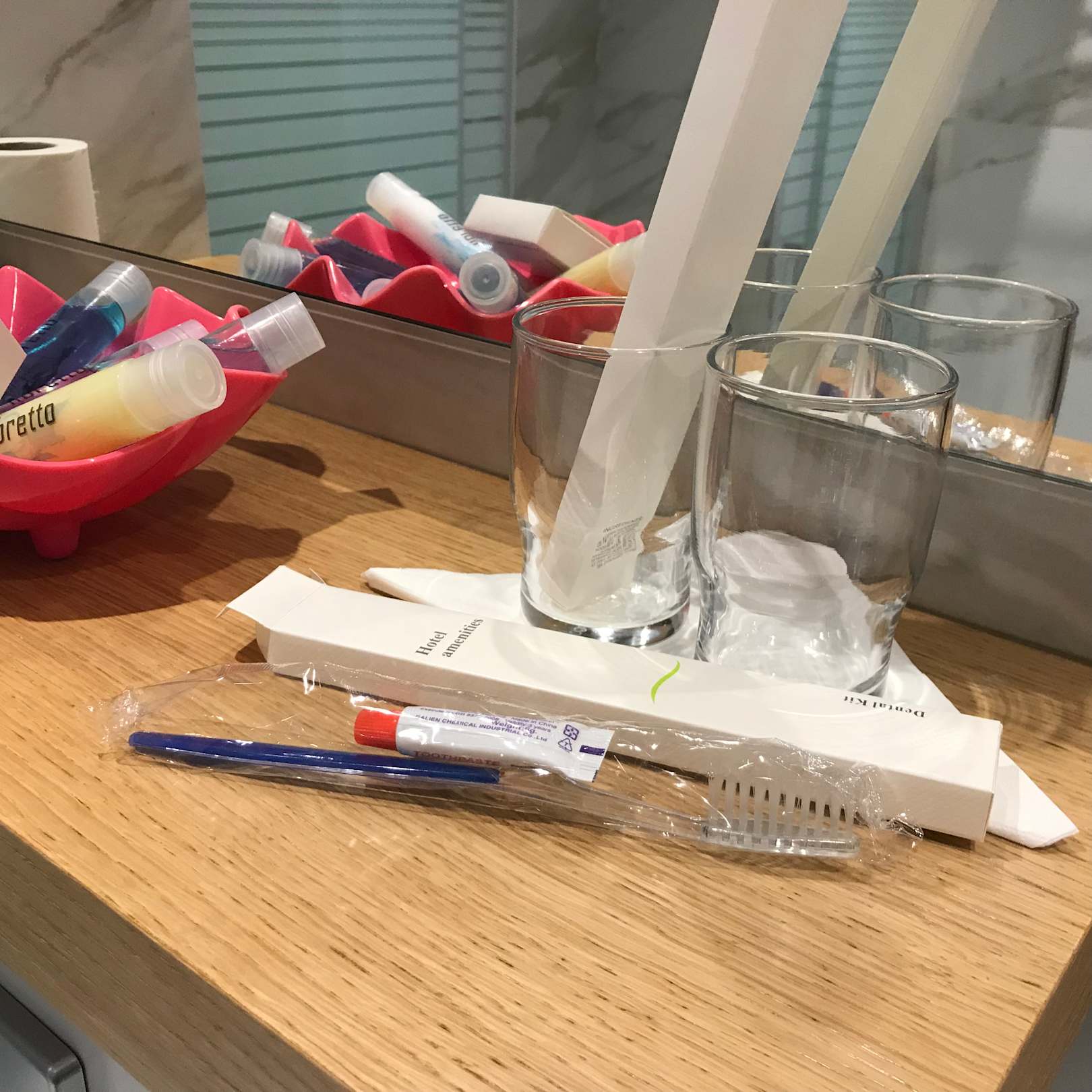 Neben Shampoo und Duschgel gab es sogar Zahnbürsten und Zahnpasta. Die von Bürsten sind zwar nicht die aller besten jedoch eine nette co Geste und durchaus nützlich falls man seine daheim vergessen hat.