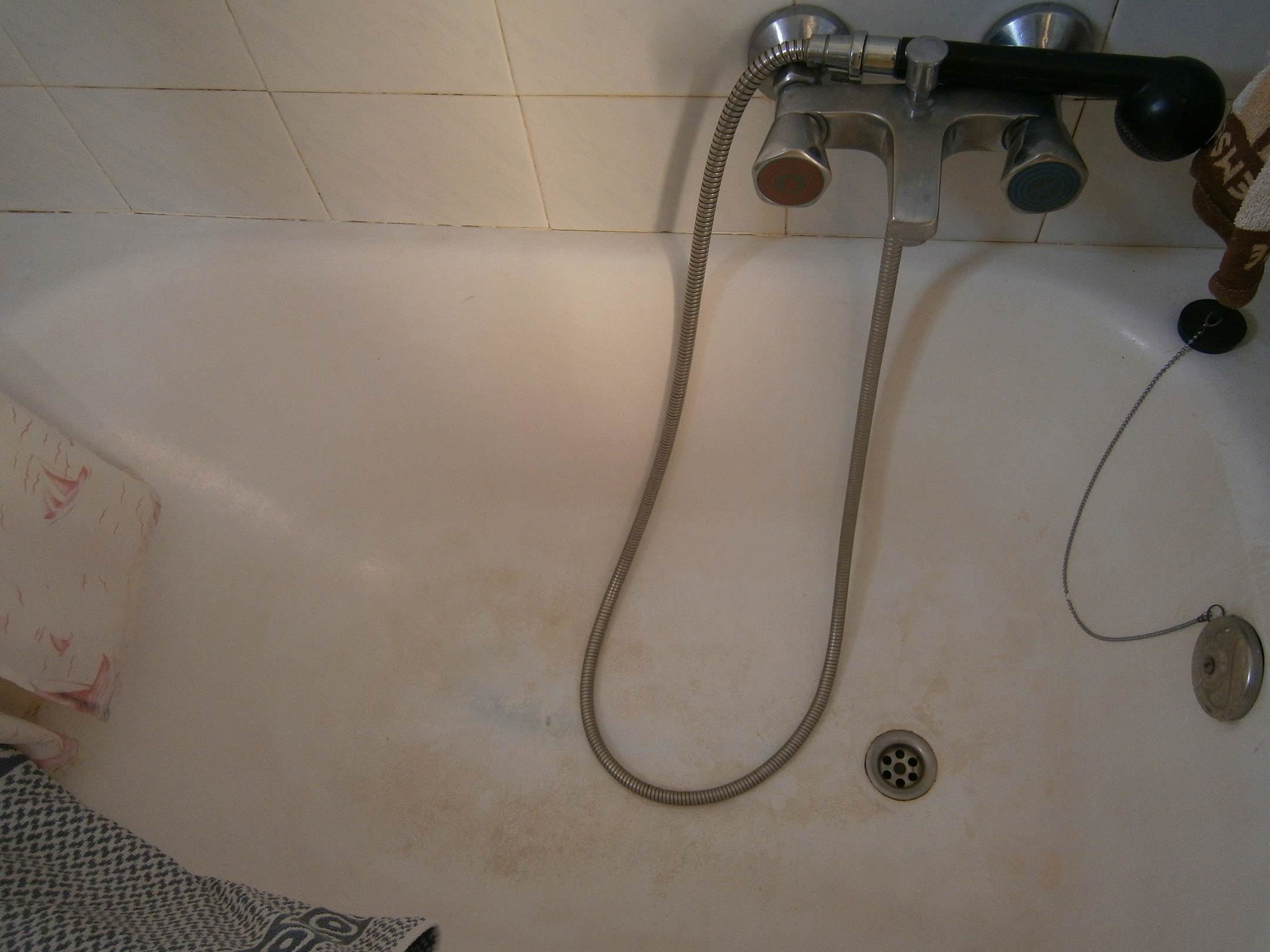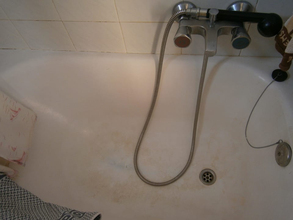 Wanne mit abgenutztem EmailleWas man hier sieht, ist kein Schmutz sondern die Wanne ist schon so angenutzt, dass das Blech durchschaut.