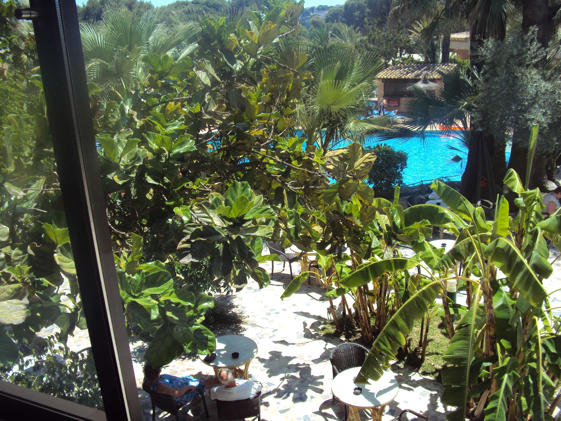 Blick vom Restaurant in den Hotelgarten