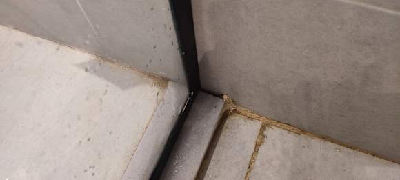 Besagte Fuge schimmlig, schlecht verfugt ekelhaft und Wasser floss auf andere Seite zum Klo