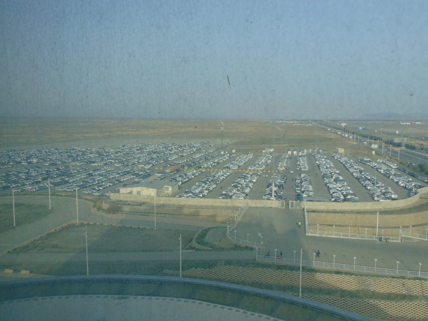 Leider war die Sicht etwas getrübt durch die verschmutzten Fensterscheiben. Der Parkplatz des Airports.