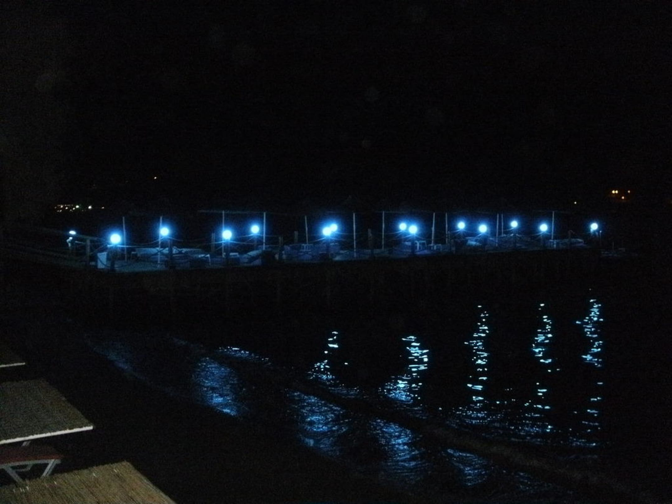 Le ponton de l'hotel vu la nuit.