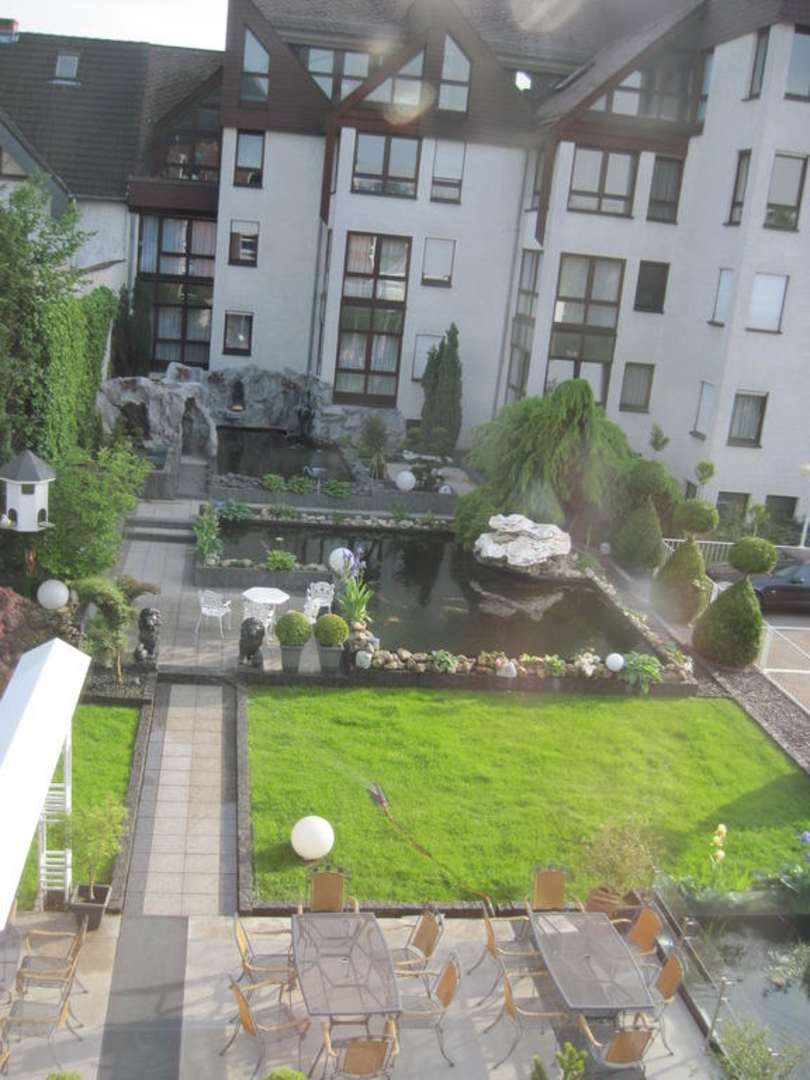 Hotelgarten von obenHinterm Haus befindet sich der wunderschöne, gepflegte Hotelgarten mit seinen Koi Becken und dem Schildkrötenteich.