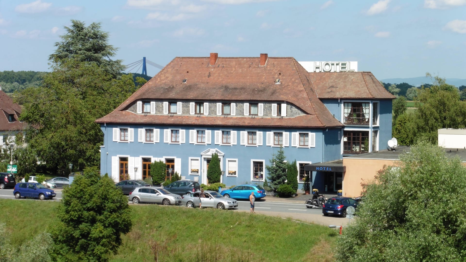 Blick von der Autobrücke aus auf das Hotel
