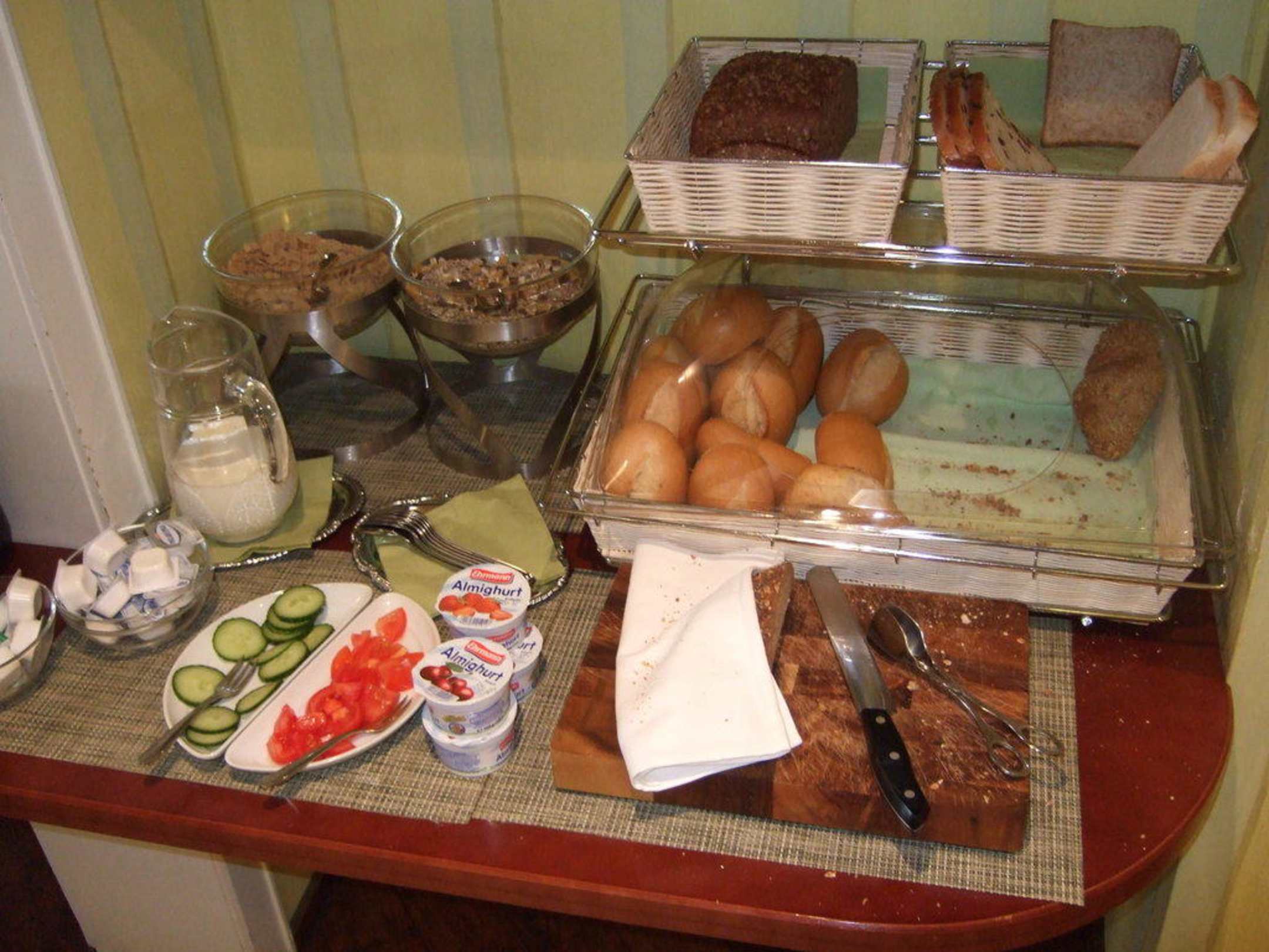 Brot, Brötchen, das "Mini-Müsli-Buffet" und das Frühstücksgemüse bilden den Rest des Frühstücksbuffets (siehe die beiden anderen Bilder)