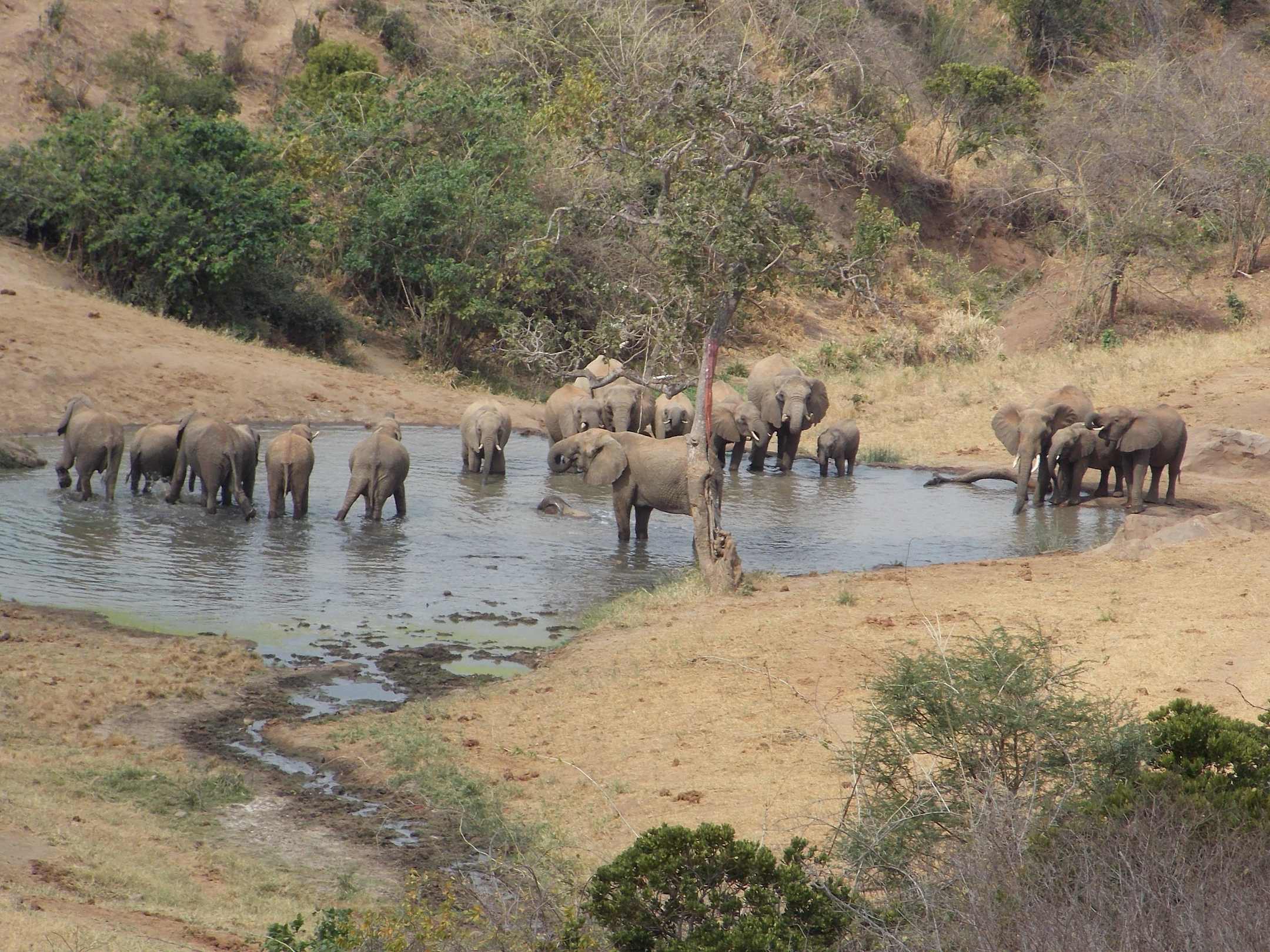 Elefantengruppe am Wasserloch im Rhino Valley Geführte Touren LadyM Safaris Diani Beach