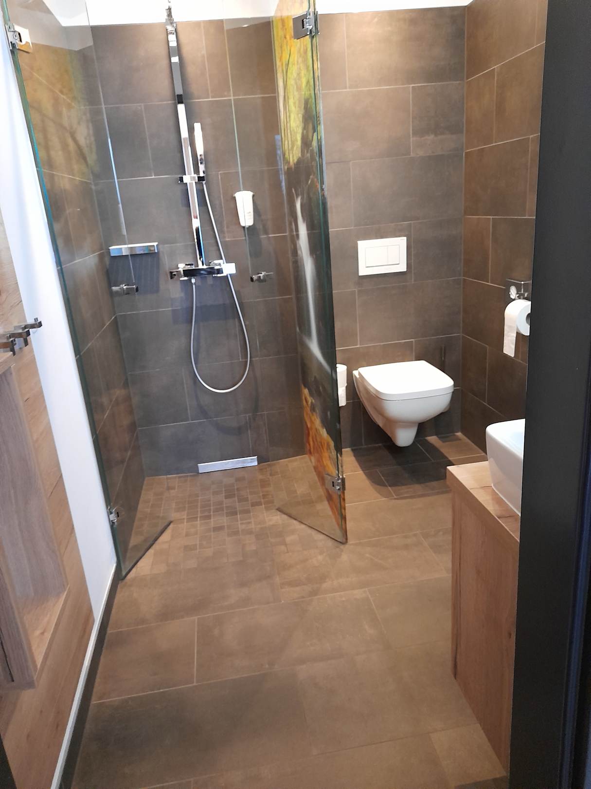 Badezimmer mit Dusche, WC, Waschbecken und jede Menge Spiegel - Studio Deluxe