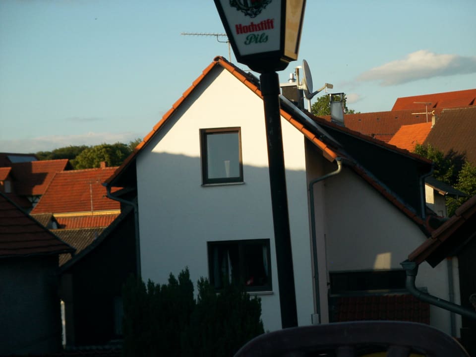 Blick auf unser Zimmer (oben) von der RückseiteBlick vom "Biergarten" auf unser Zimmer, oben unter dem Dachgiebel.