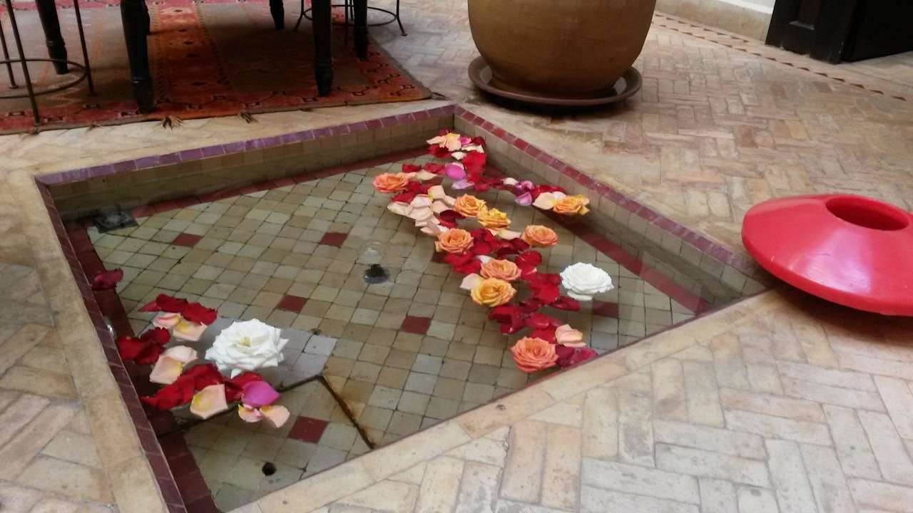 Wasserbecken mit frischen Rosenblättern