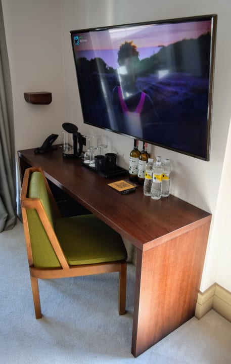 Schreibtisch im Zimmer und großes Smart-TV