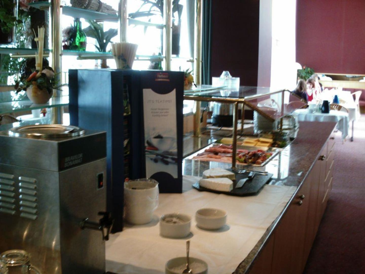 Blick beim Frühstuck auf einen Teil der Getränkeecke, im hinteren Bereich sieht man die beliebteren Sitzplätze , z.B.mit zwei Rundecken