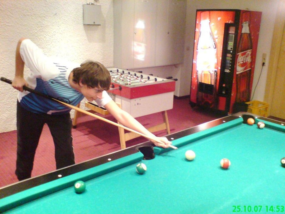 FreizeitraumHier gibt es einen grossen Billiard Raum und andere Automaten ( Flipper ) wo sich man sich Vergnügen kann.