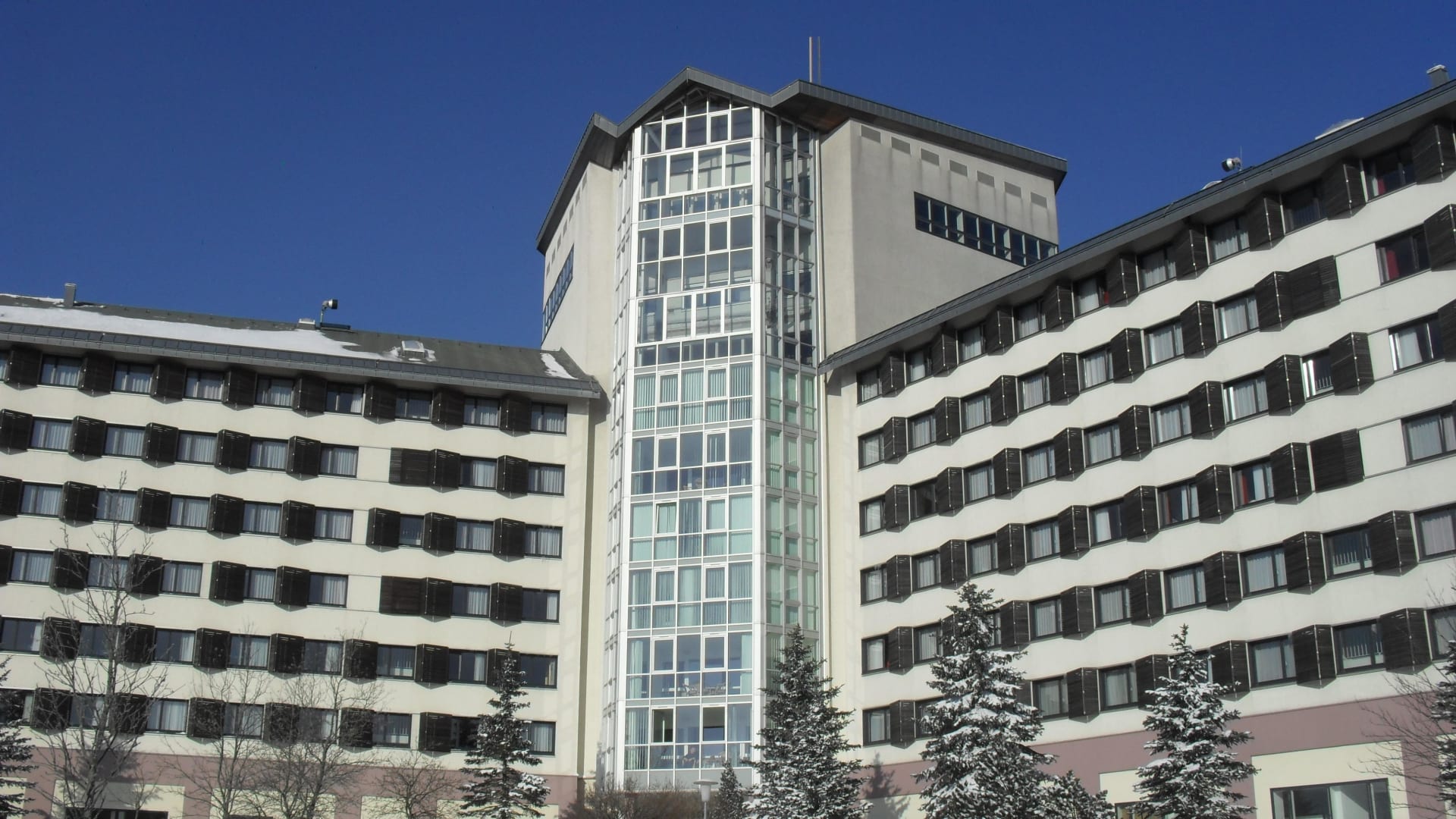 Das Hotel besteht aus zwei Flügeln. In der Mitte ist der Fahrstuhltrakt. Das Cafe im 9.Stock ist leider nicht mehr im Betrieb. Die großen Fenster gehören zu den Suiten.