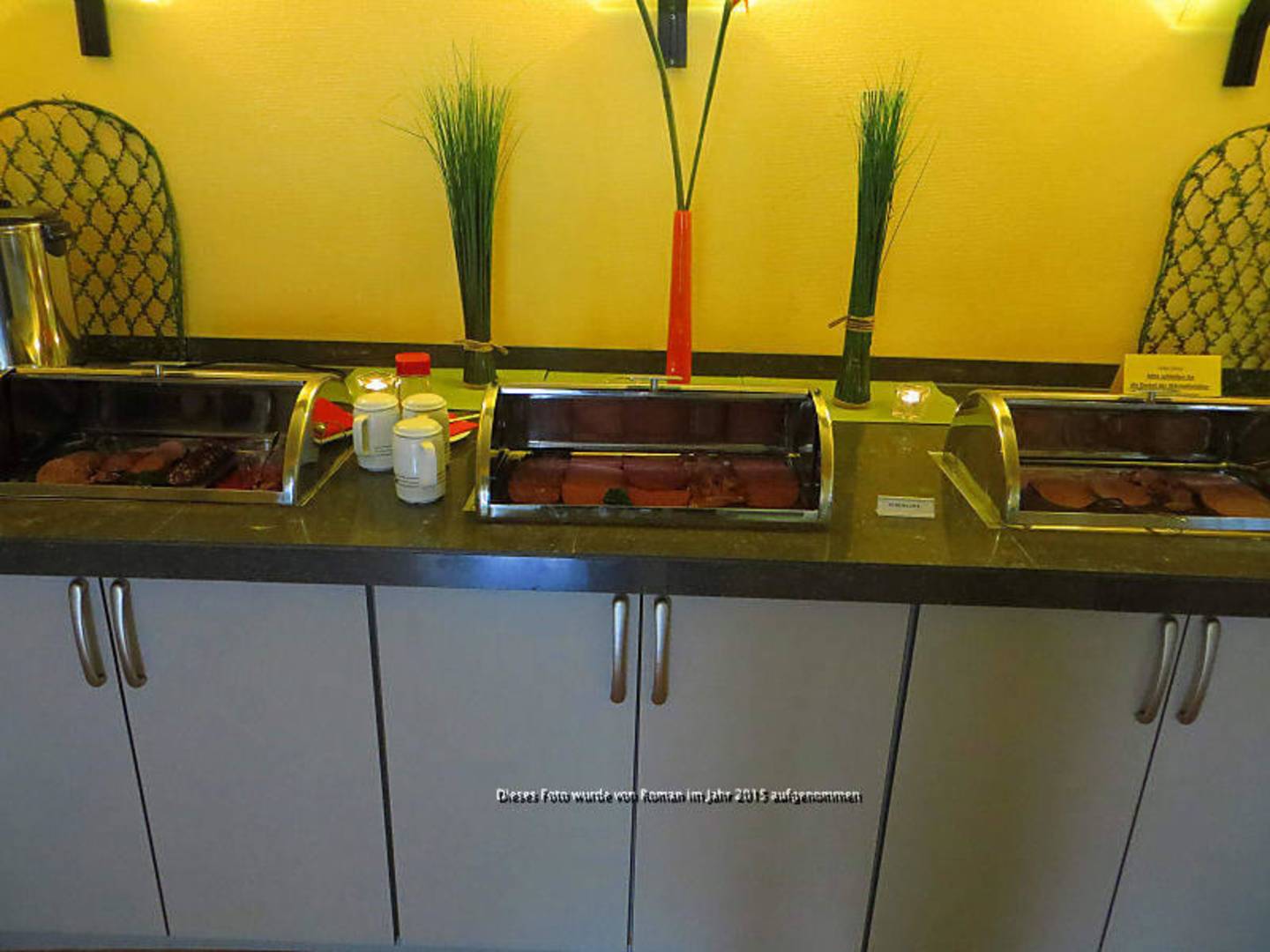 Ein Teil des FrühstücksbuffetsBei dieser schlechten Beleuchtung ist kaum zu erkennen, was in den Kästen dargeboten wird.