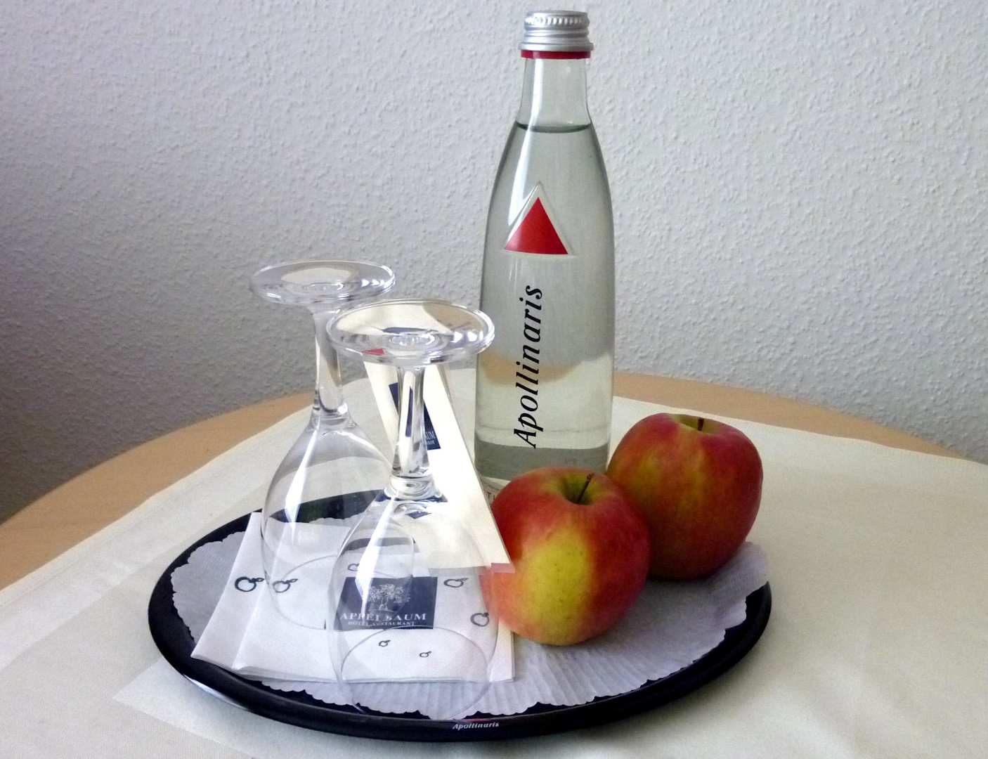 Kostenlose Flasche Mineralwasser und frische Äpfel
