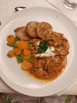 Kalbsrahngeschnetzeltes " Züricher Art" mit Gemüse und Serviettenknödel