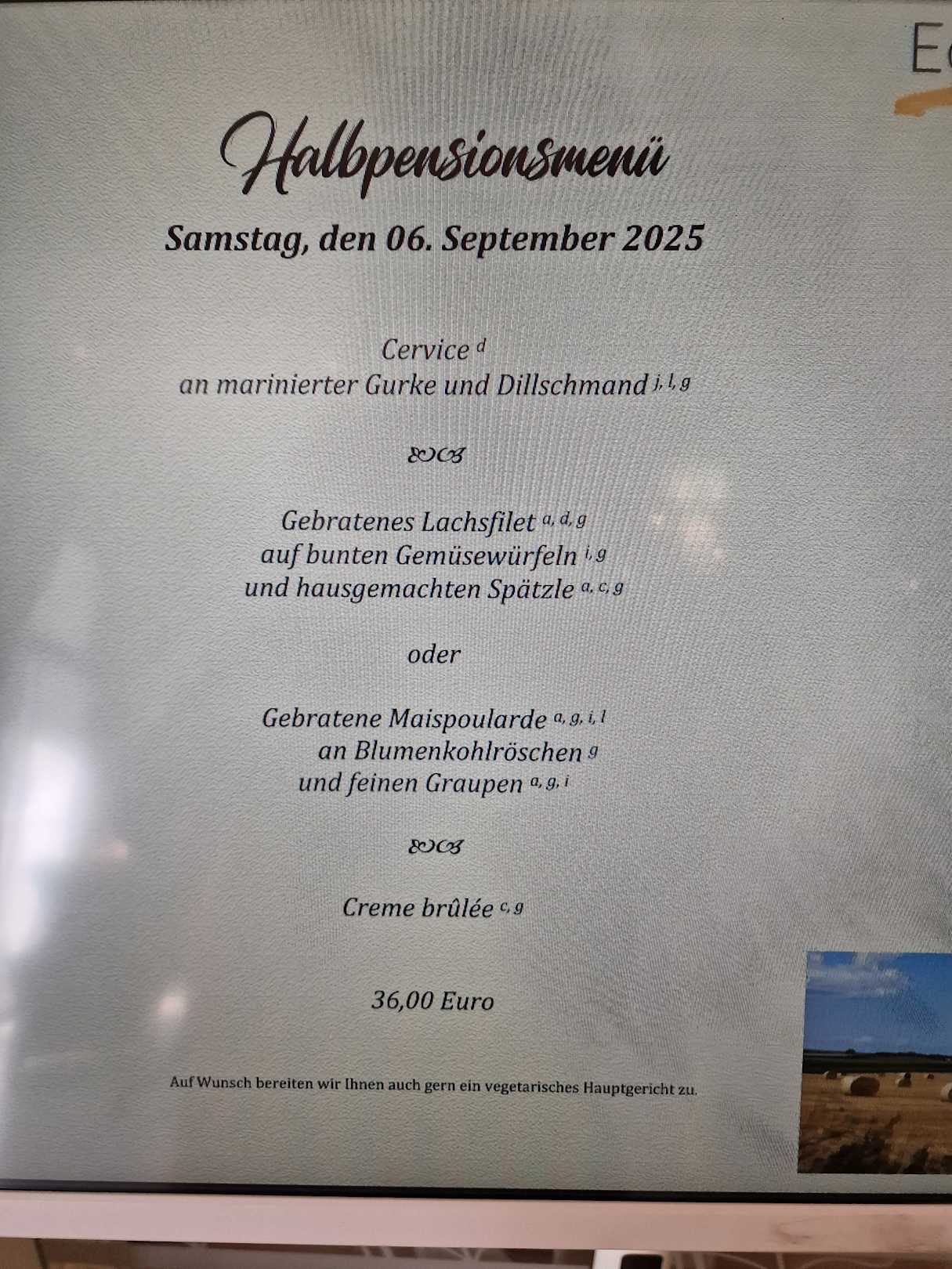 richtig wäre "Ceviche an marinierter Gurke und Dill-Schmand"