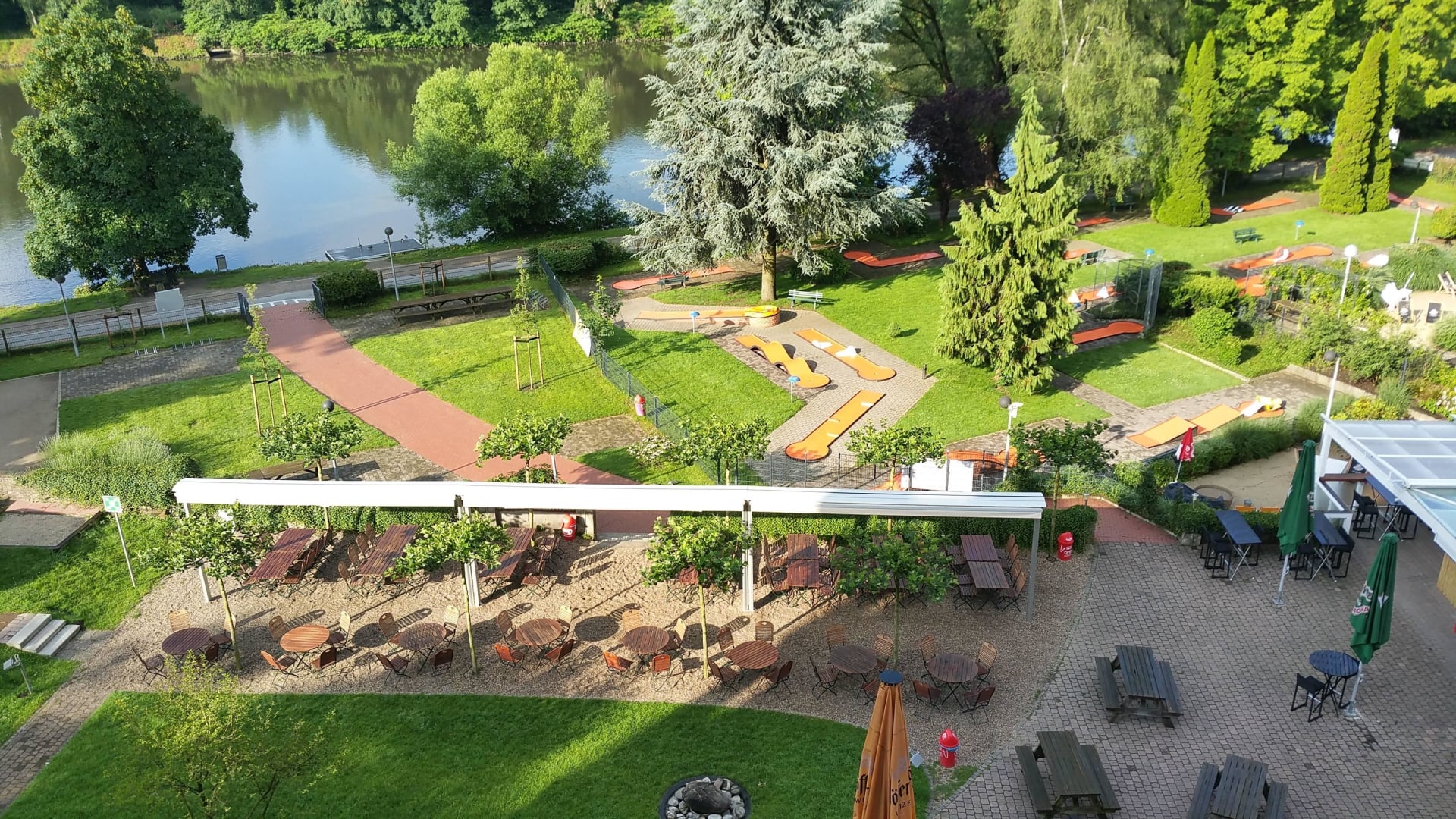 Der Biergarten von oben betrachtet. Mag sein dass es bei entsprechendem Betrieb etwas lauter wird. Aber die Zimmer haben ja schalldichte Verglasungen.