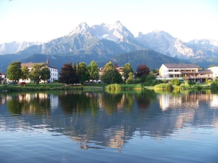 Das Hotel Ritzenhof ( in Bildmitte hinter Bäumen ) direkt am Badesee Ritzensee gelegen, mit Fitness und Saunanlage / Liegewiese ( Gebäude rechts ), auf Bild links Museum des Ortes Saalfelden