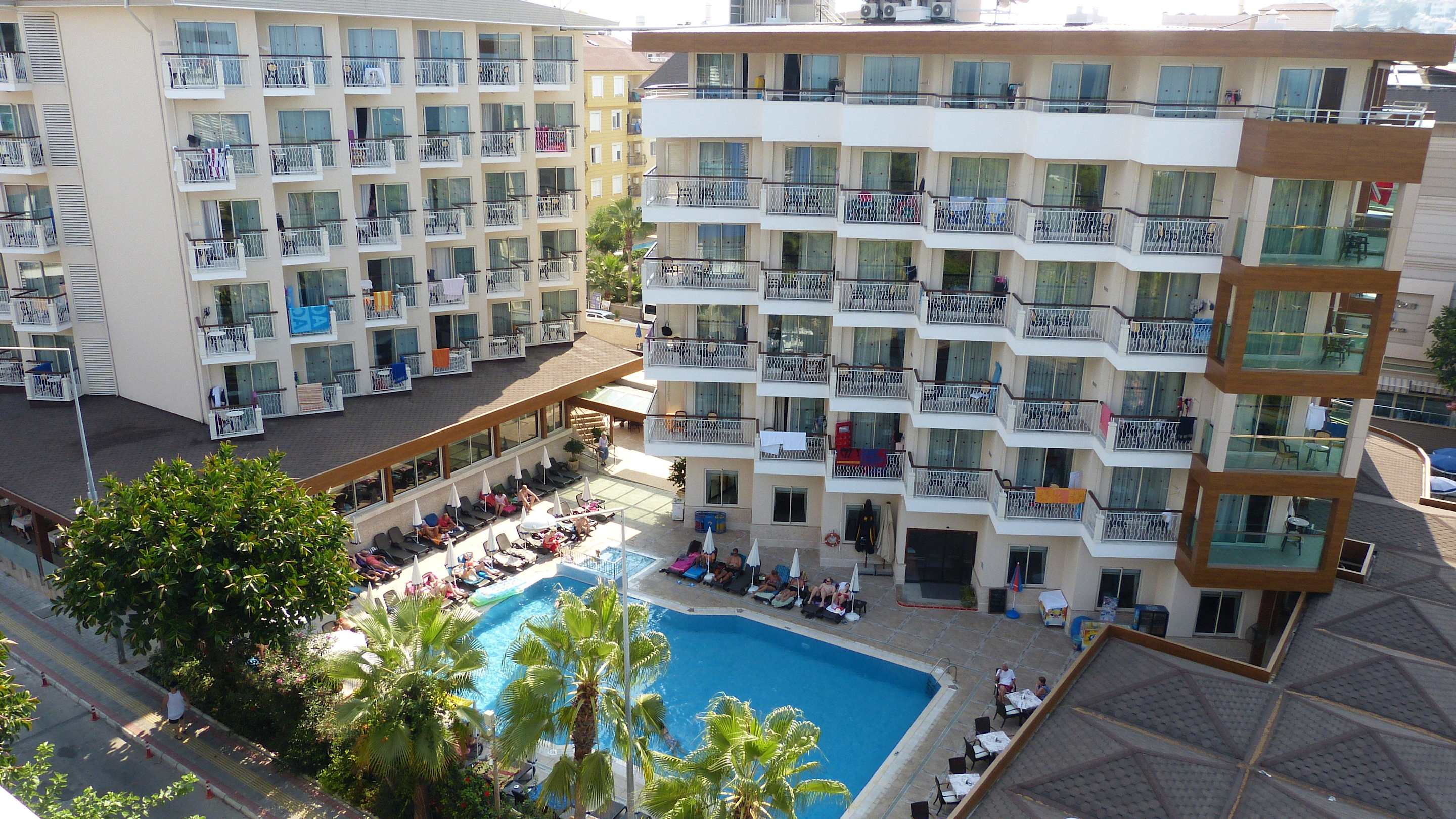 Dieses Bild zeigt die Poolseite des Hotels Riviera. Die Aufnahme wurde vom obersten Stockwerk des Nachbarhotels "Gardenia" gemacht.