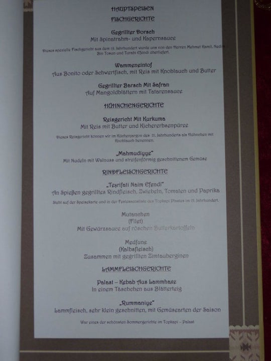 Menukarte Osmanisches RestaurantOsmanisches a la carte Restaurant, die Karten stehen in Englisch, Deutsch, Russich und Türkisch zur Verfügung.