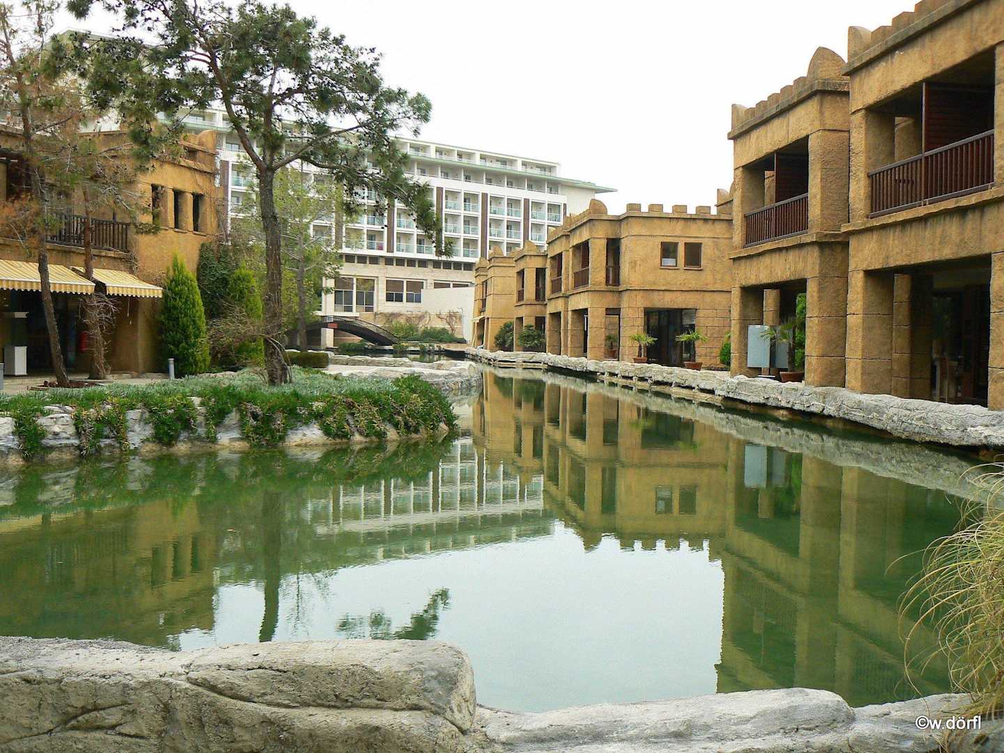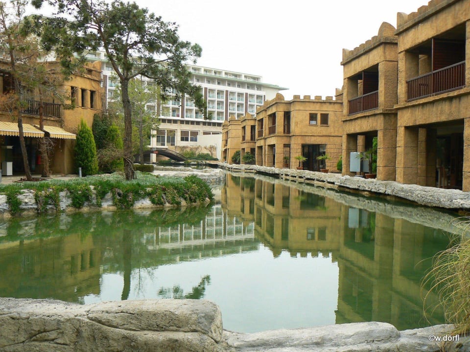 Troydorf mit Blick auf das Hauptgebäude - von hier kann man in gepflegter Anlage seinen Morgenspaziergang durch den RIXOS Park machen