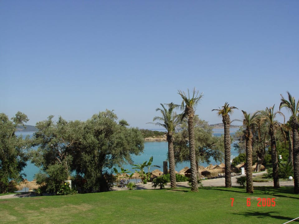 Blick vom Garten zur Strandanlage und Meer