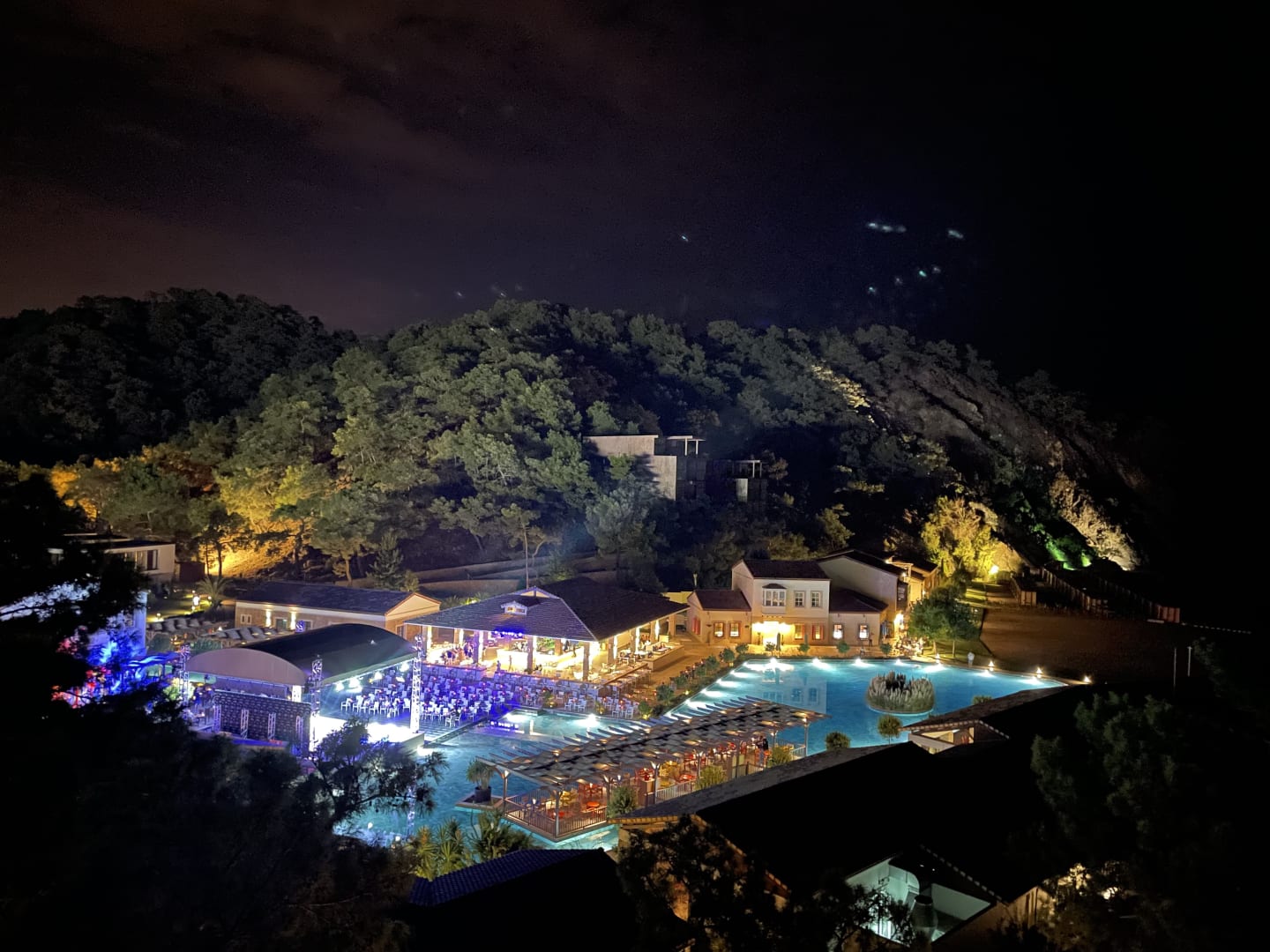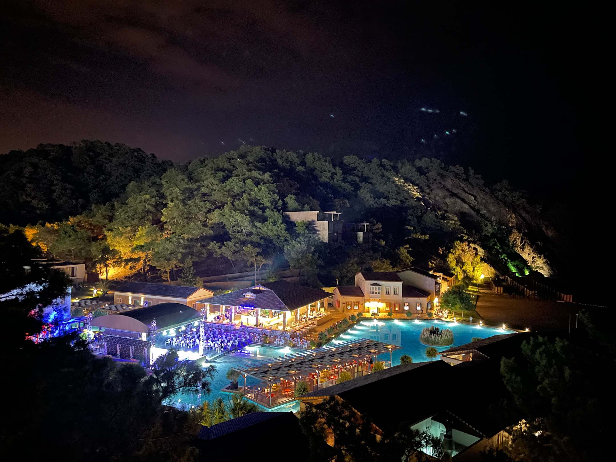 Blick auf Showbühne und Bar
