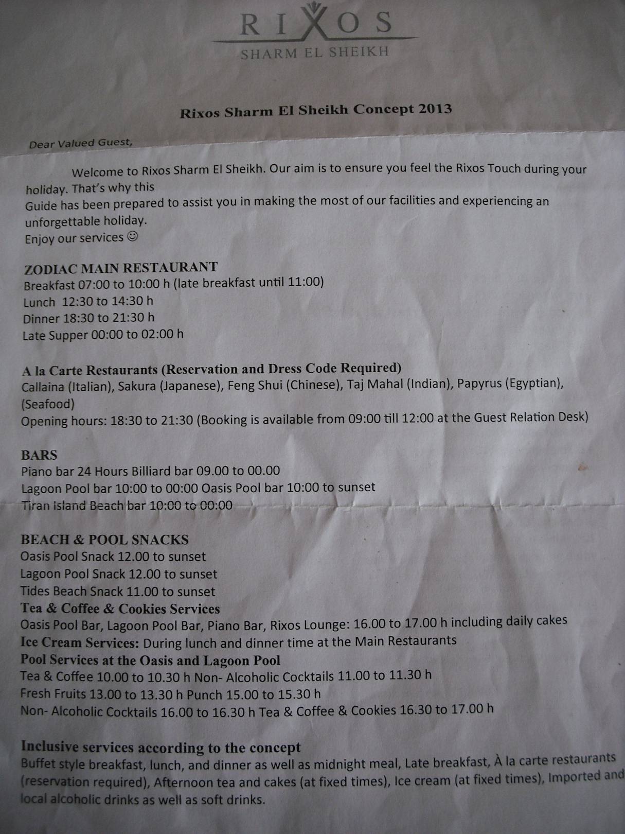 Hier sieht man die Restaurants und Bars aufgelistet mit Öffnungszeiten und Service.
