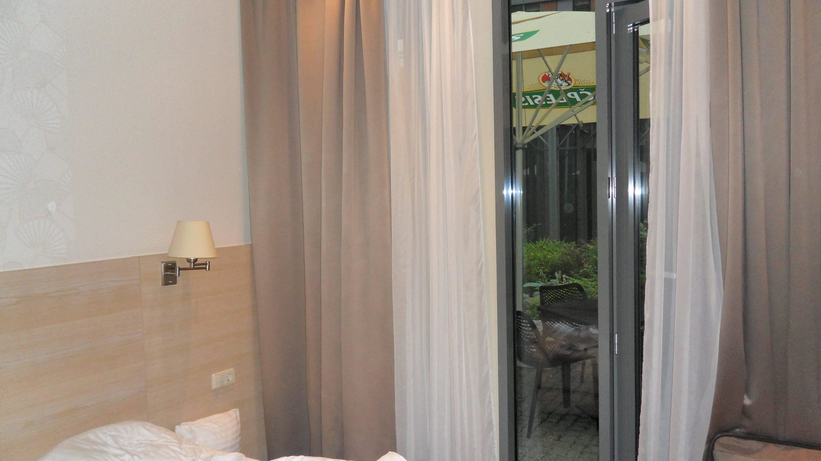 Mit Blick auf die Rauchertische des Restaurants