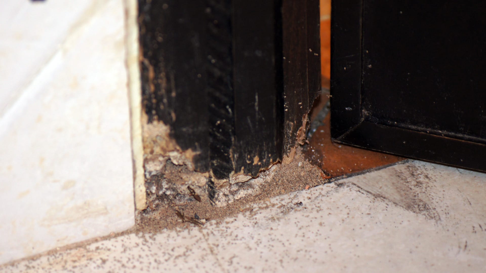 Der Türrahmen ist marode und verfault. Zu sehen sind kleine Tierchen, die den Rahmen weiter zerfressen. Zu erkennen ist auch deutlich, dass hier nicht mit der erforderlichen Sorgfalt gewischt wurde.