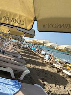 Da der Strand aufgrund der Brandung immer schmaler wird ist nun alles mit Liegen eng an eng gestellt.