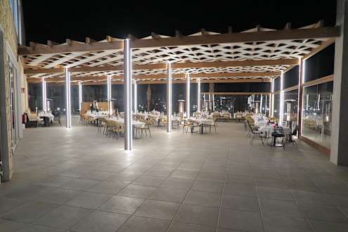GastroBlick in einen Teil des Außenbereichs vom Hauptrestaurant. Hier erkennt man die fest installierte Beschattungsanlage.