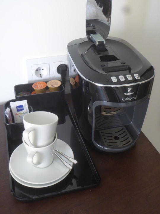 ZimmerEs gibt diese Tee-/Kaffeemaschine in jedem Zimmer. Sofern die bei Anreise vorhandenen Kapseln nicht ausreichen, kann man zusätzliche für je 0,63 € an der Rezeption erwerben.